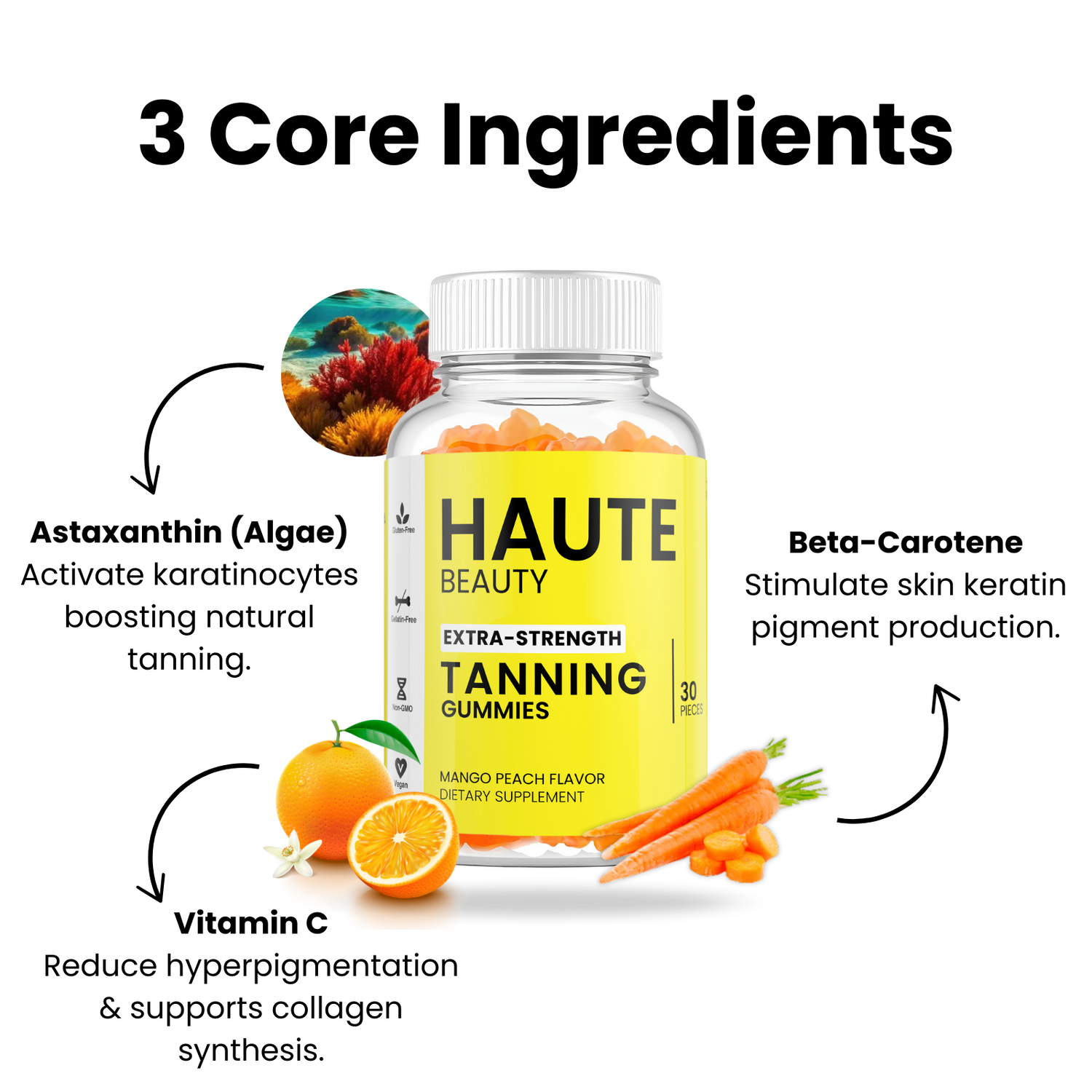 Our Haute Tanning Gummies are formulated with two powerful ingredients—Beta Carotene and Astaxanthin. These aren't just ordinary antioxidants; they’re part of the carotenoid family, natural pigments found in plants. With consistent use, these carotenoids accumulate in your skin, giving it a radiant golden tone that mimics a natural tan while also helping to reduce redness!